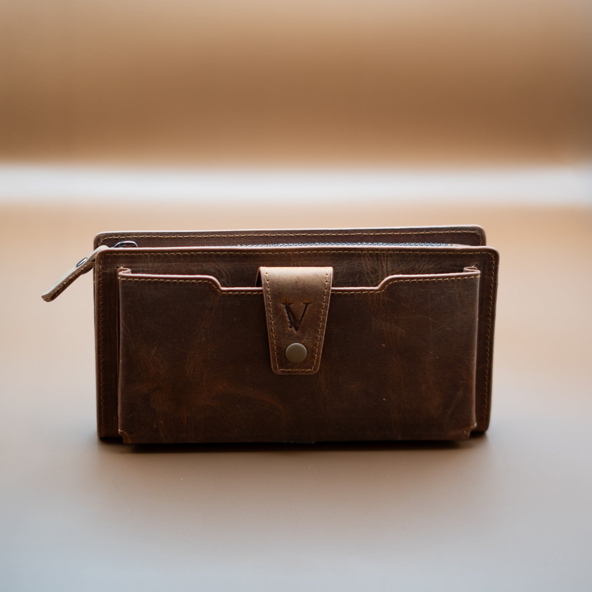 The Victor Vincent Élan is a sophisticated, multifunctional leather wallet designed for both women and unisex use. Crafted from a curated blend of Flother (textured grain), Crazy (mat distressed), and Tiguan (aged-effect) genuine leathers, this elegant piece effortlessly combines style and practicality. Measuring 10 cm x 19 cm, it accommodates your phone, cards, and essentials with refined ease.